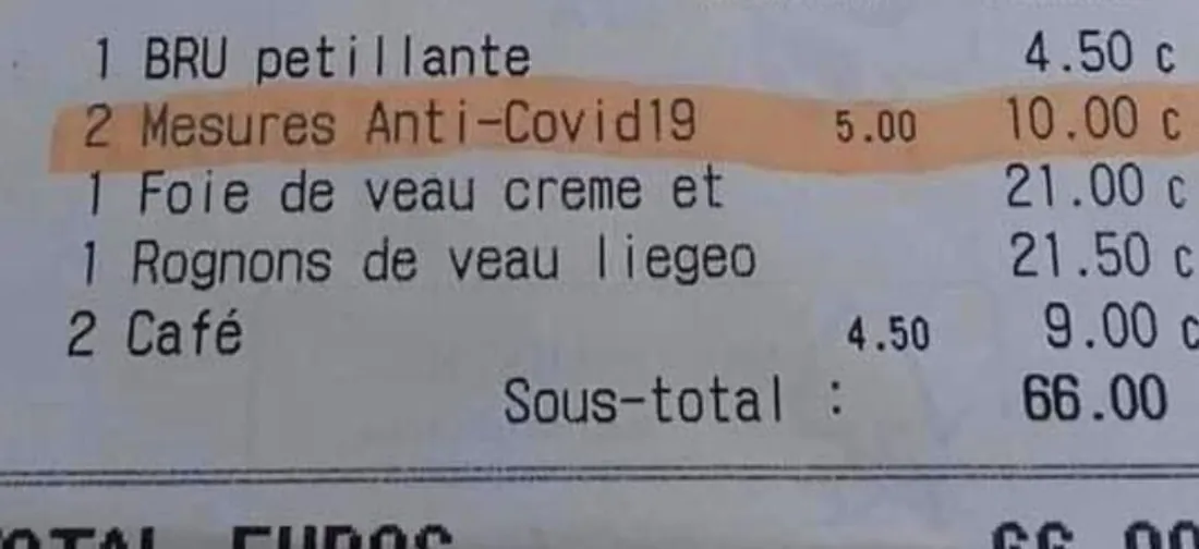 Si la plupart des restaurants européens ont pu enfin réouvrir leurs portes après plusieurs longues semaines de fermeture due à l'épidémie de coronavirus, les conditions sanitaires restent très strictes. En effet, ils ont pour obligation de respecter une distance de plus d'un mètre entre les tables, de limiter le nombre de personnes ou encore d'imposer le port du masque à leur personnel. Des règles qui ont poussé un restaurant de Bruxelles, en Belgique, d'instaurer une taxe baptisée ici "mesures anti-Covid" afin de compenser les investissements consentis depuis le déconfinement. Une mesure qui a suscité l'indignation de deux clients qui n'ont pas manqué de publier leur ticket de caisse sur Facebook.