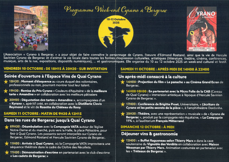 Vous avez sûrement reconnu la tirade tirée du livre Cyrano de Bergerac, le personnage d’Edmond Rostand sera à l’honneur ce week-end à Bergerac. Déambulation dans les rues samedi matin, projection du film "Le Panache" samedi après-midi, représentation de théâtre en soirée. Le tout est proposé par l’association Cyrano à Bergerac. Ce rendez-vous se tient ce samedi 11 et dimanche 12 octobre. Toutes le programme est à retrouver ici.